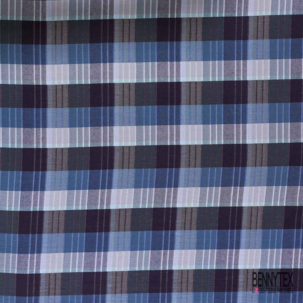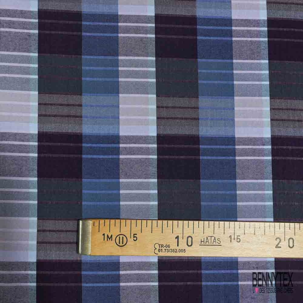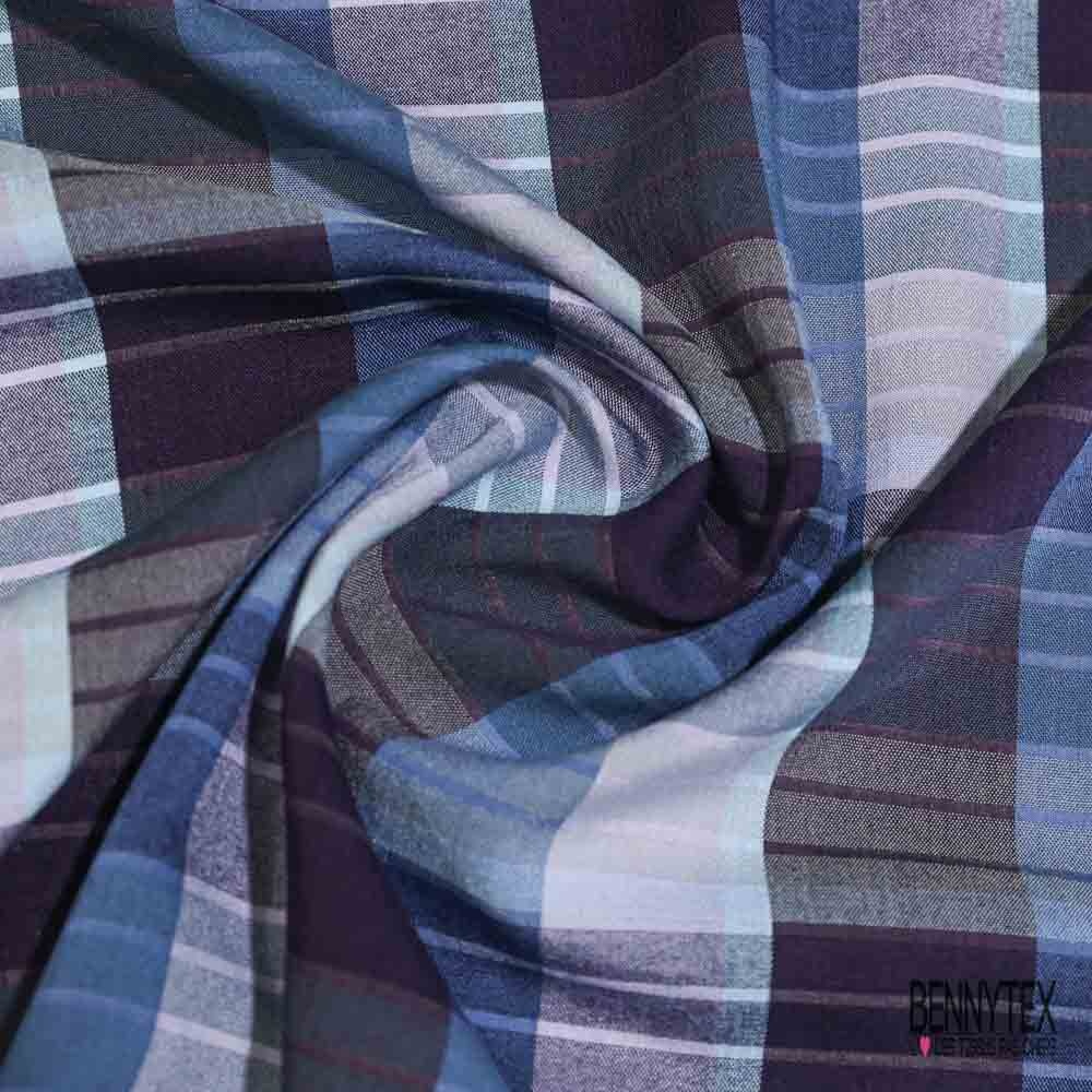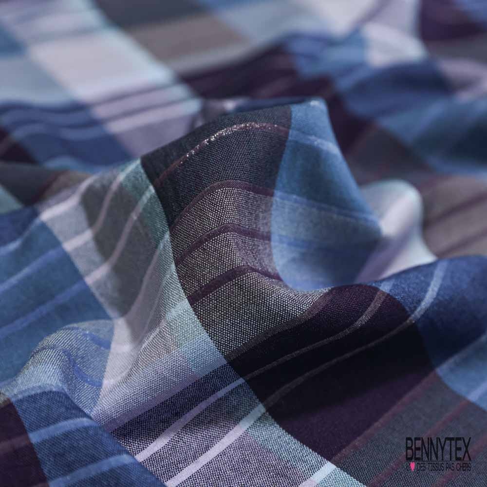 Coton viscose tissé teint motif carreau indigo aubergine lilas lurex argent