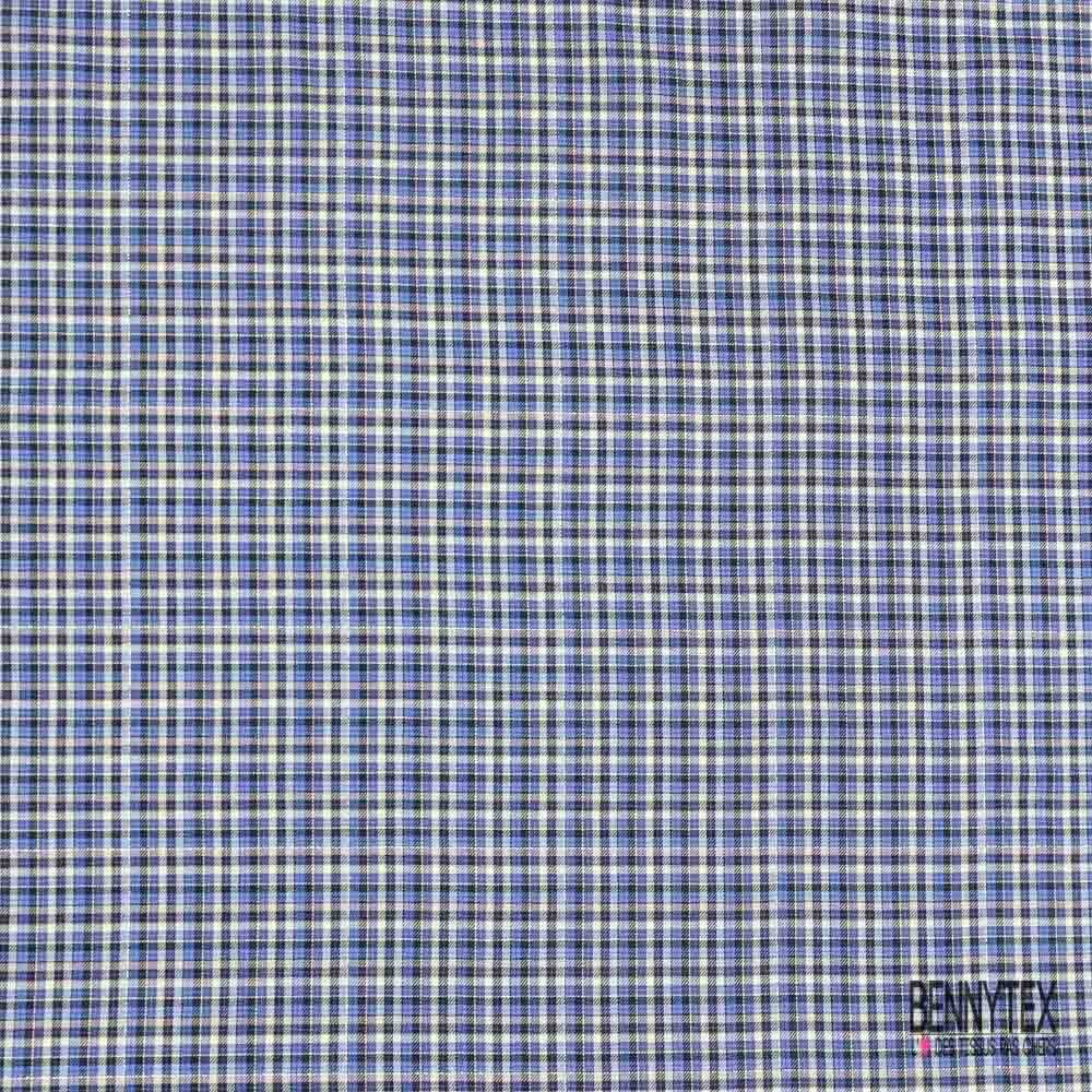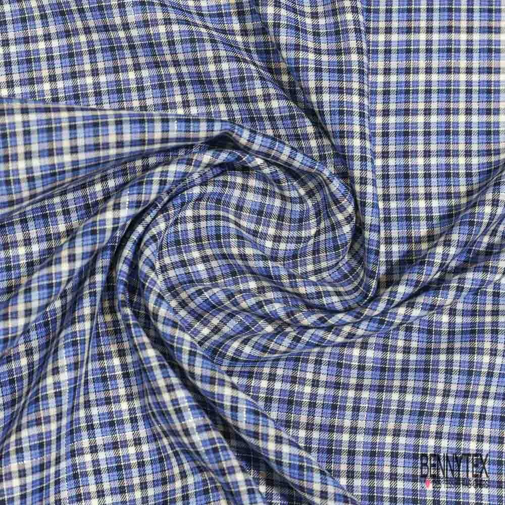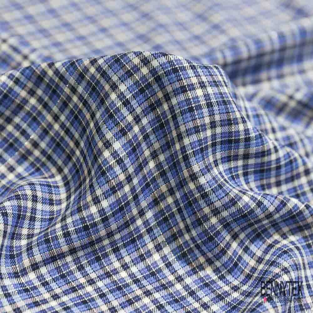 Coton viscose tissé teint motif carreau bleu noir blanc discret lurex argent