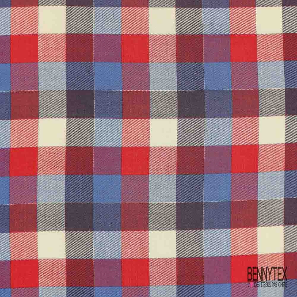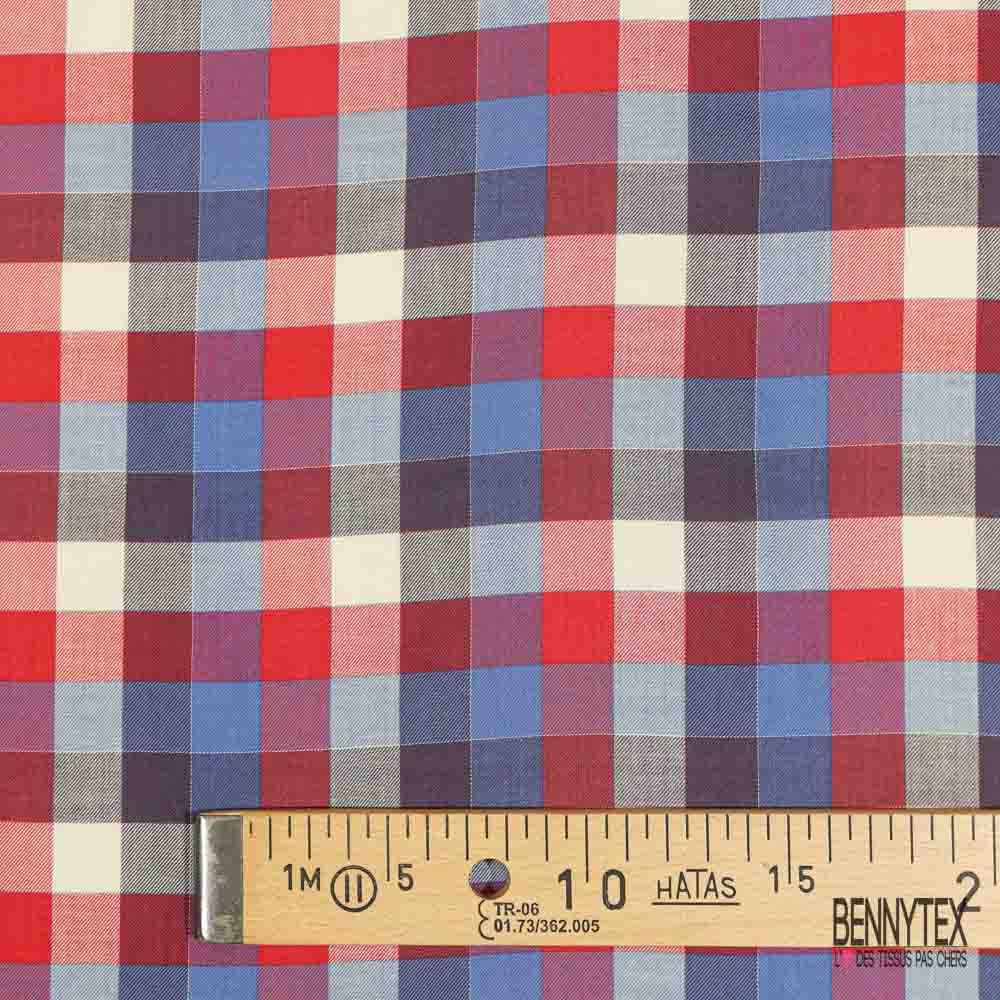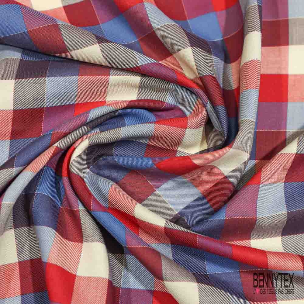 Coton viscose tissé teint carreaux bleu rouge blanc discret noir
