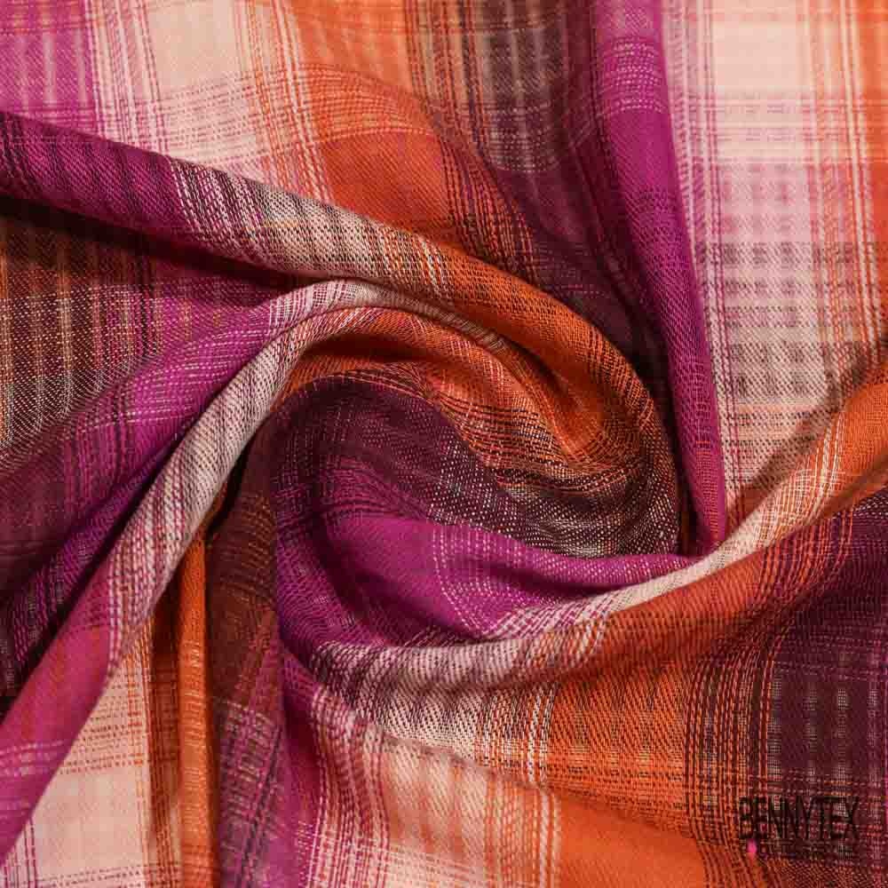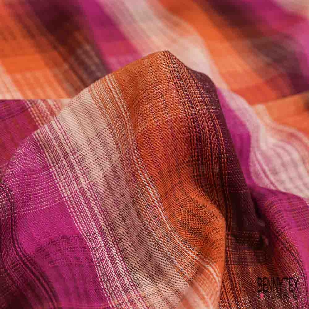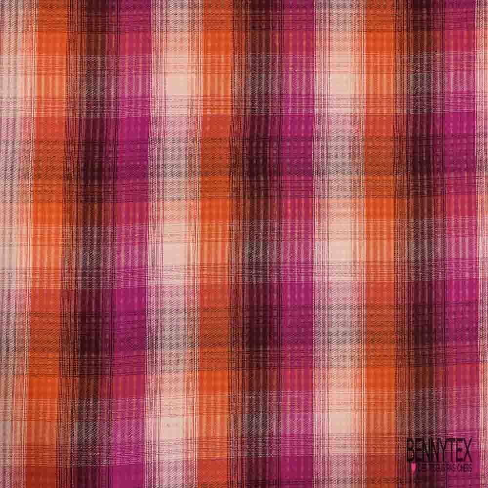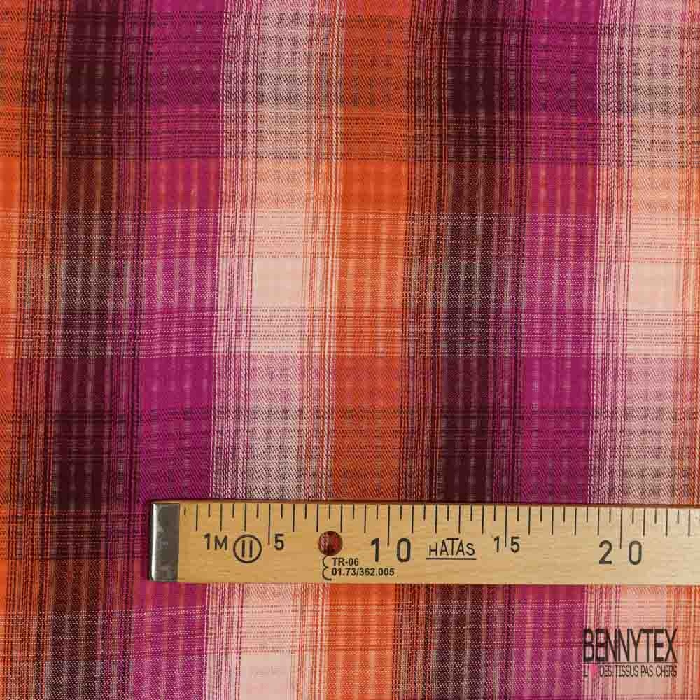 Coton tissé teint motif écossais lie de vin orchidée rose pâle corail