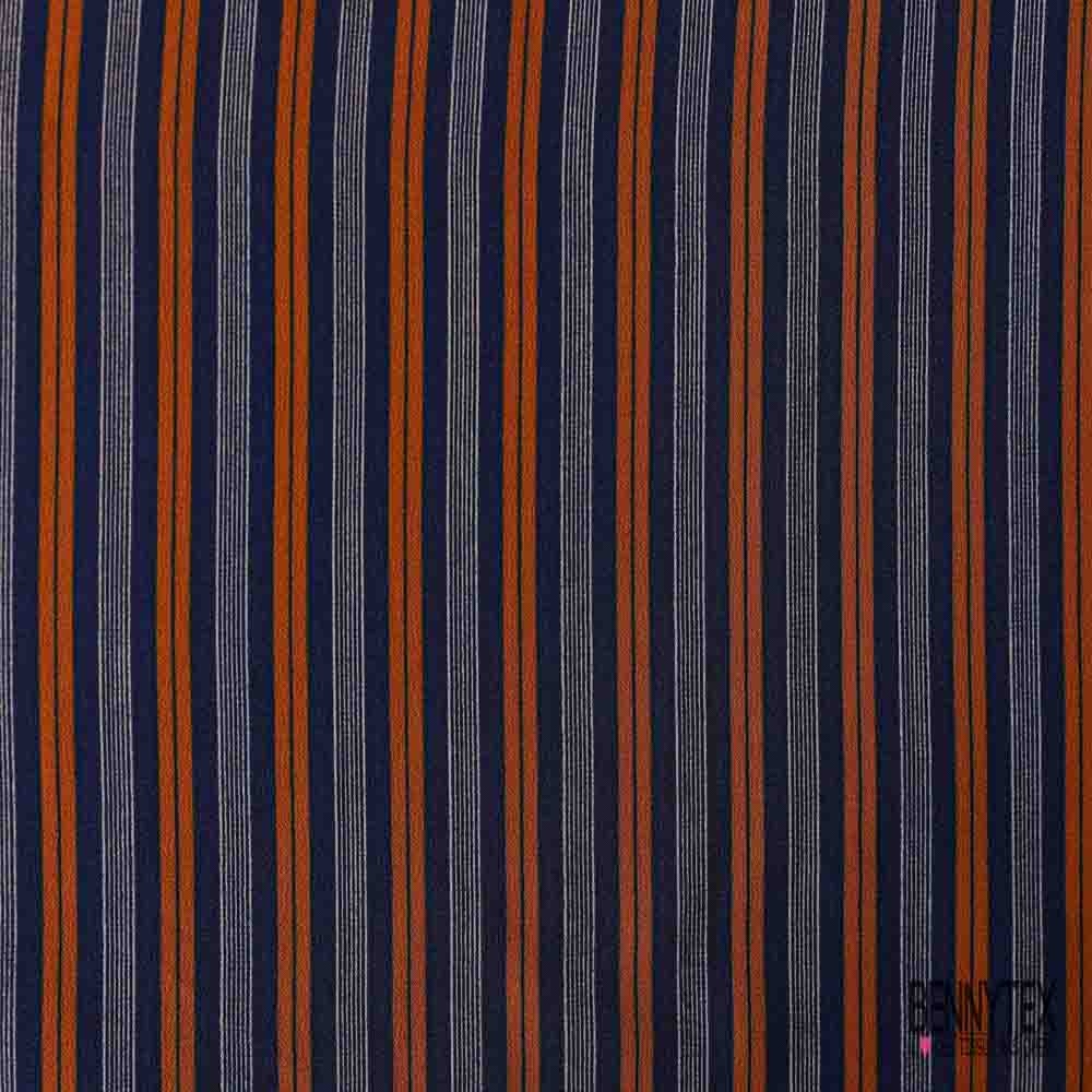 Le Crêpe viscose digital rayure verticale marine blanc optique orange est un tissu donnant un superbe tombé, idéale pour pantalon fluide, chemisiers, robe, jupe...