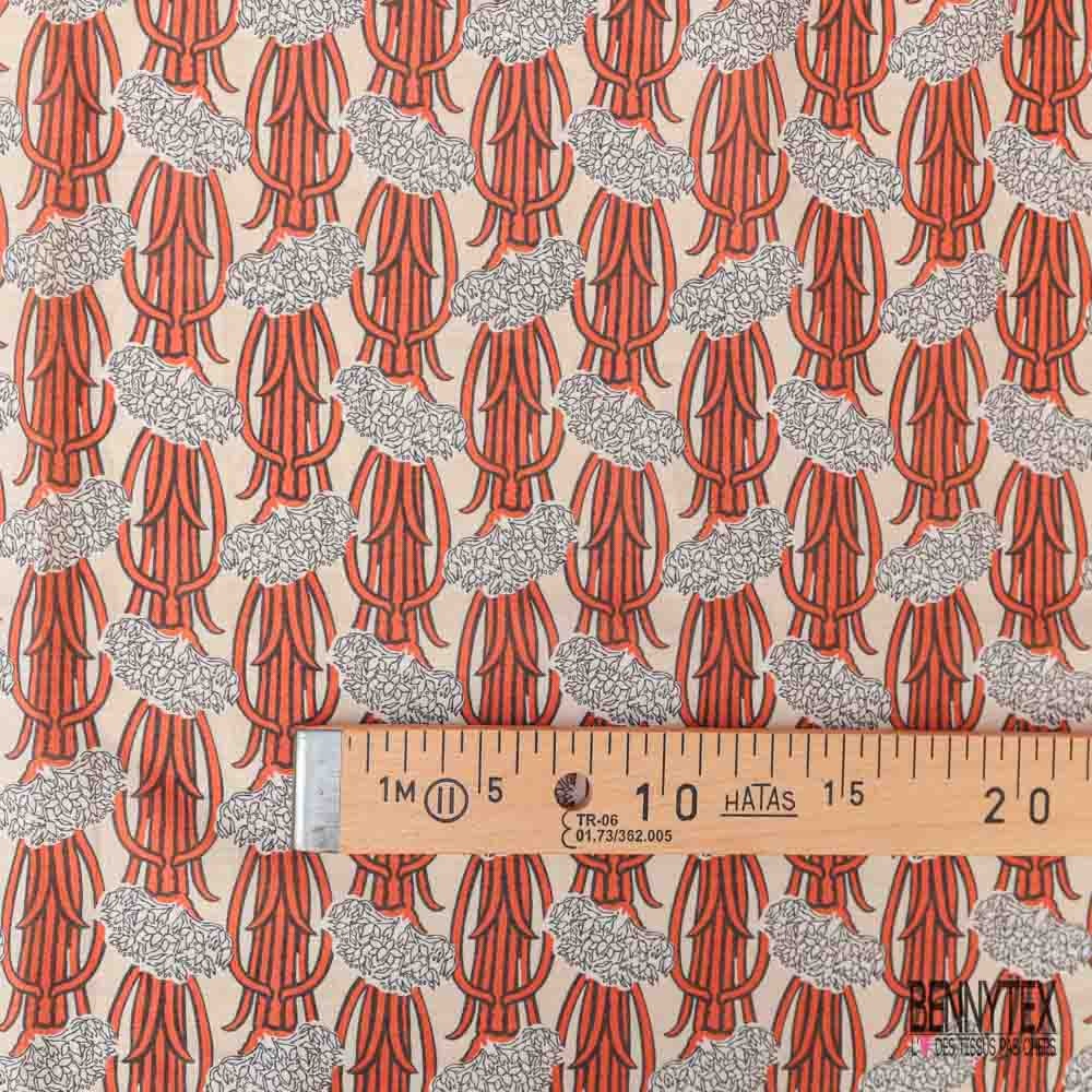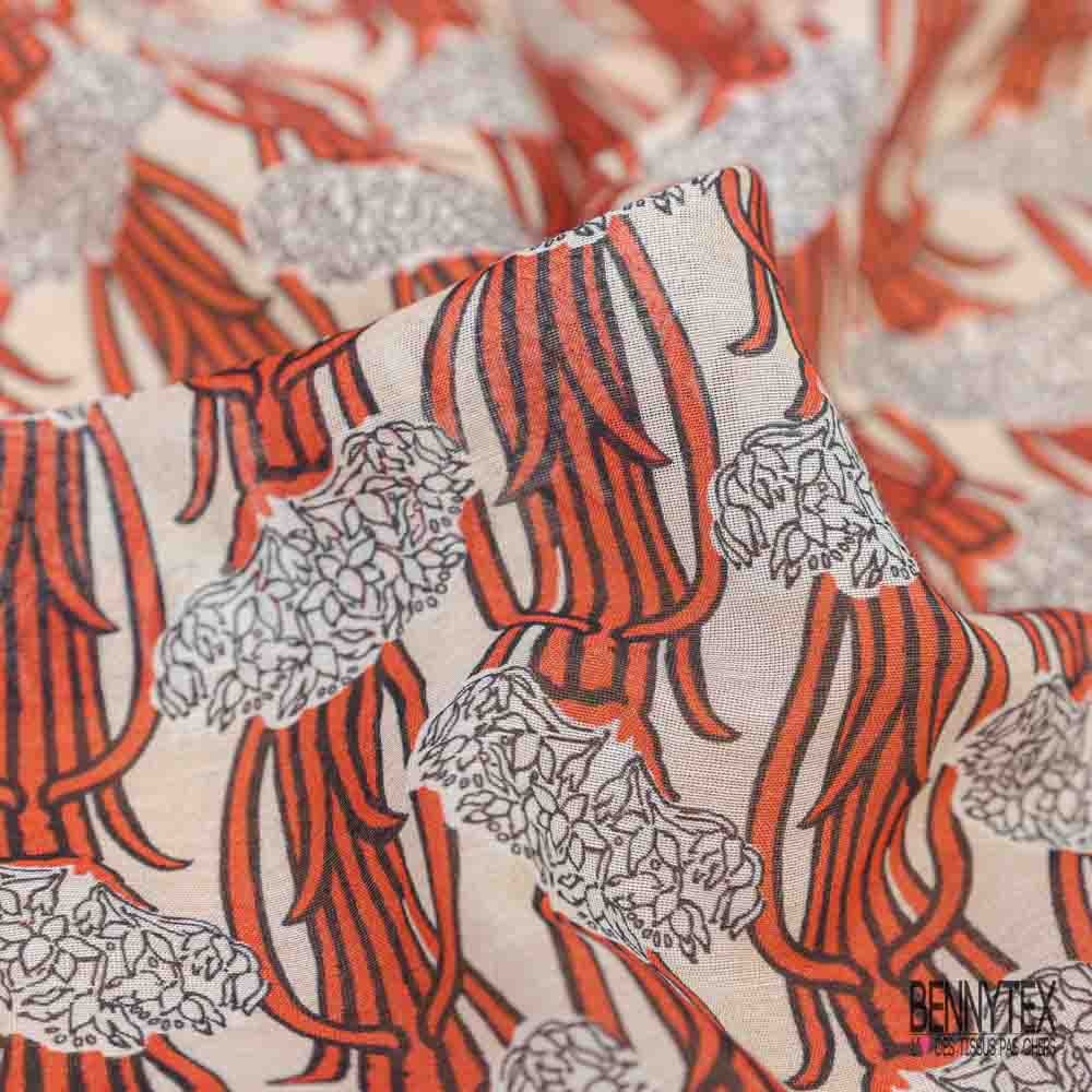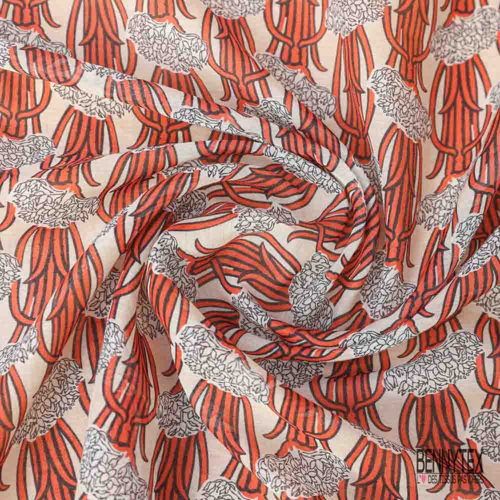 Voile soie coton imprimé plante abstraite ton orange mandarin fond blanc cassé