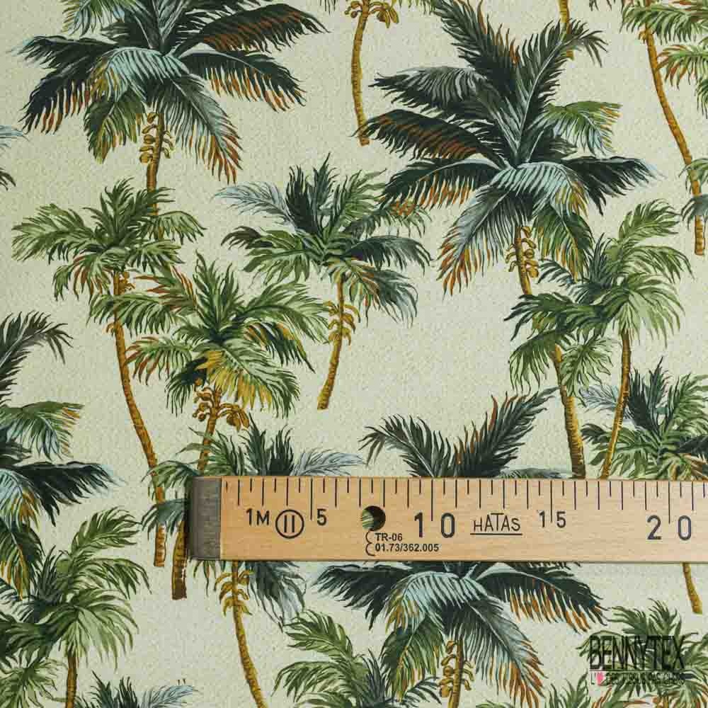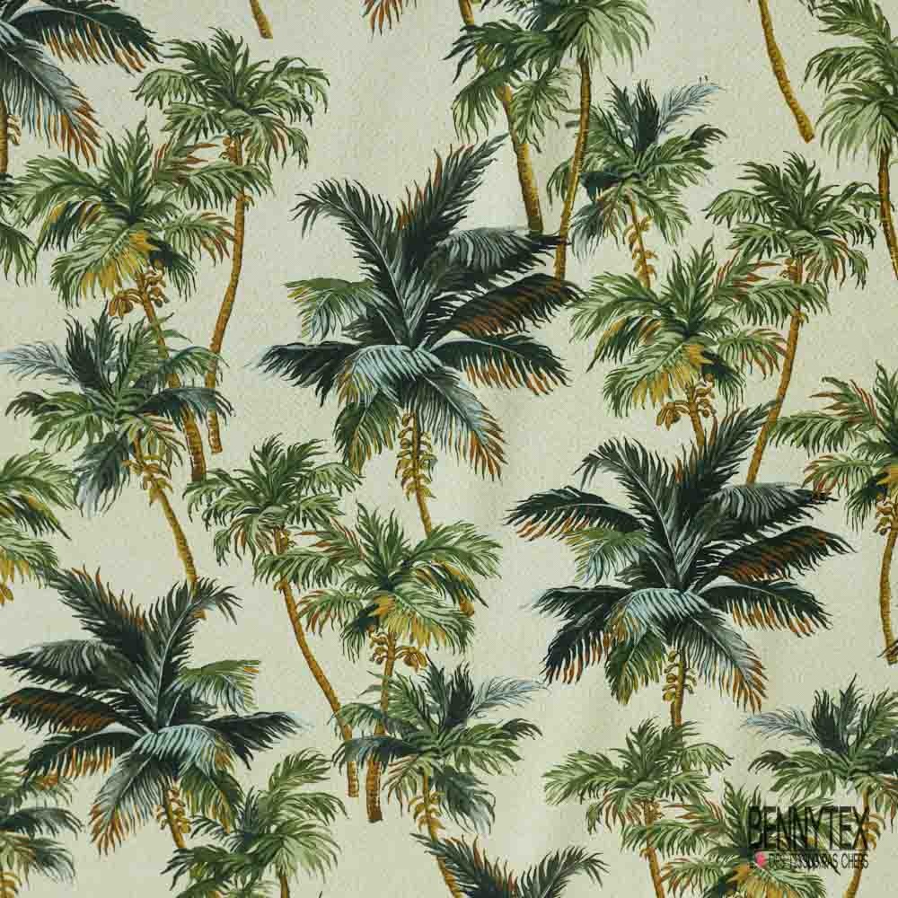 Satin coton élasthanne imprimé palmier fond crème stylisé
