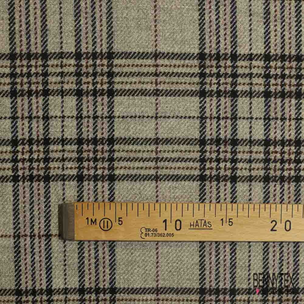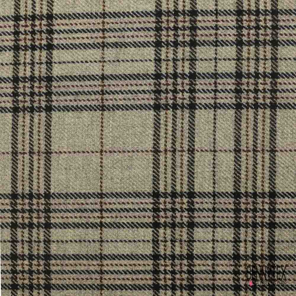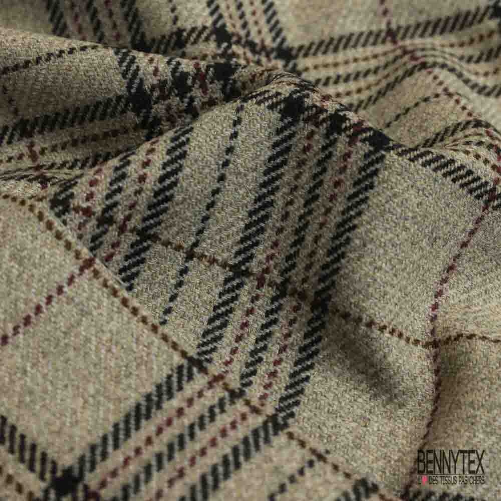 Laissez-vous séduire par notre Laine vierge souple fin tartan noir bordeaux marron fond beige