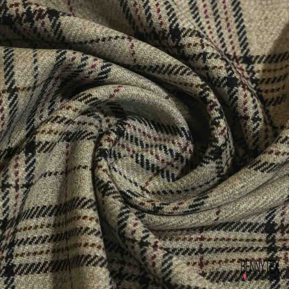 Laine vierge souple fin tartan noir bordeaux marron fond beige