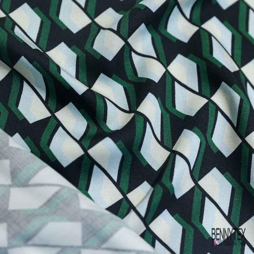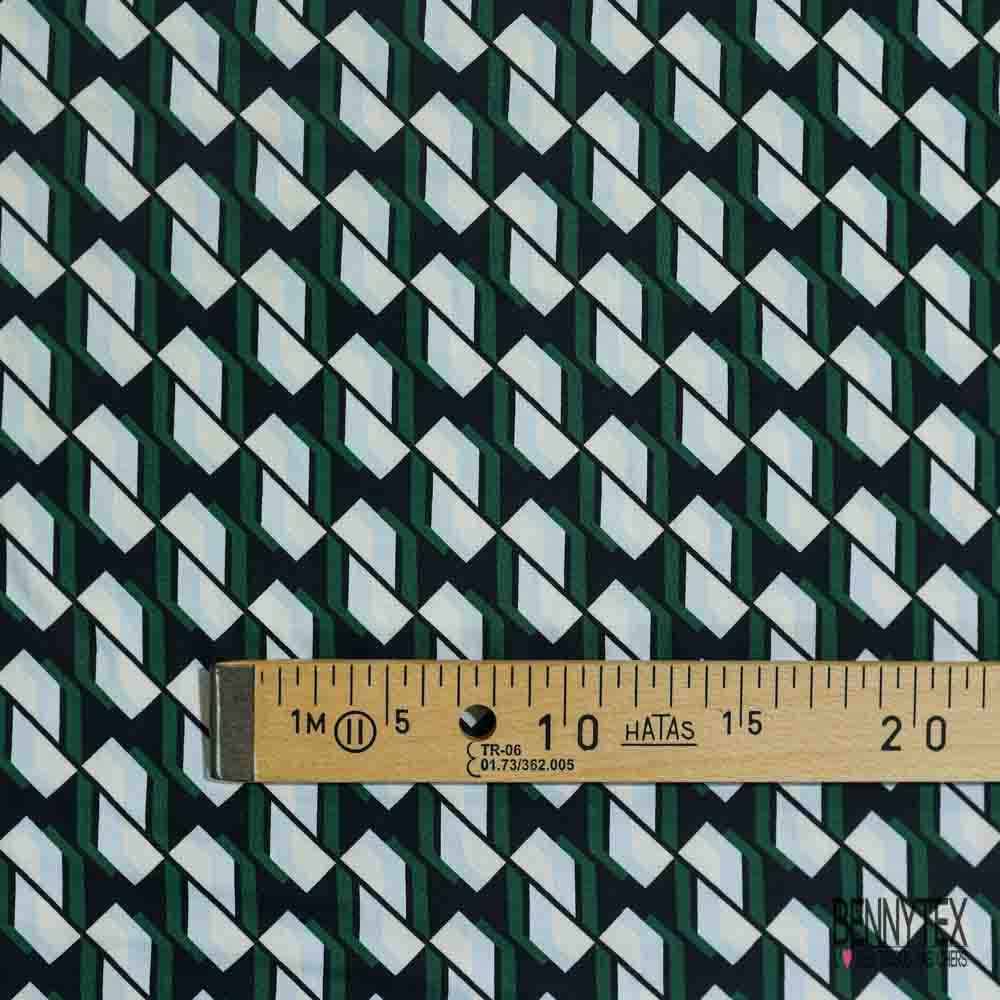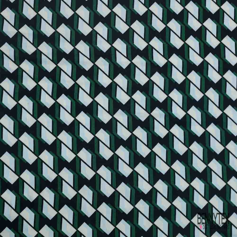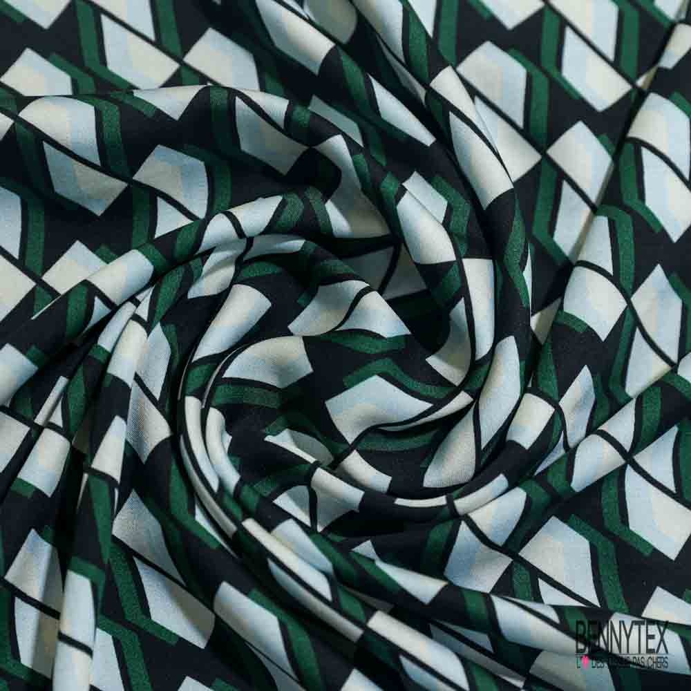 Satin viscose imprimé digital géométrique noir sapin ciel blanc cassé