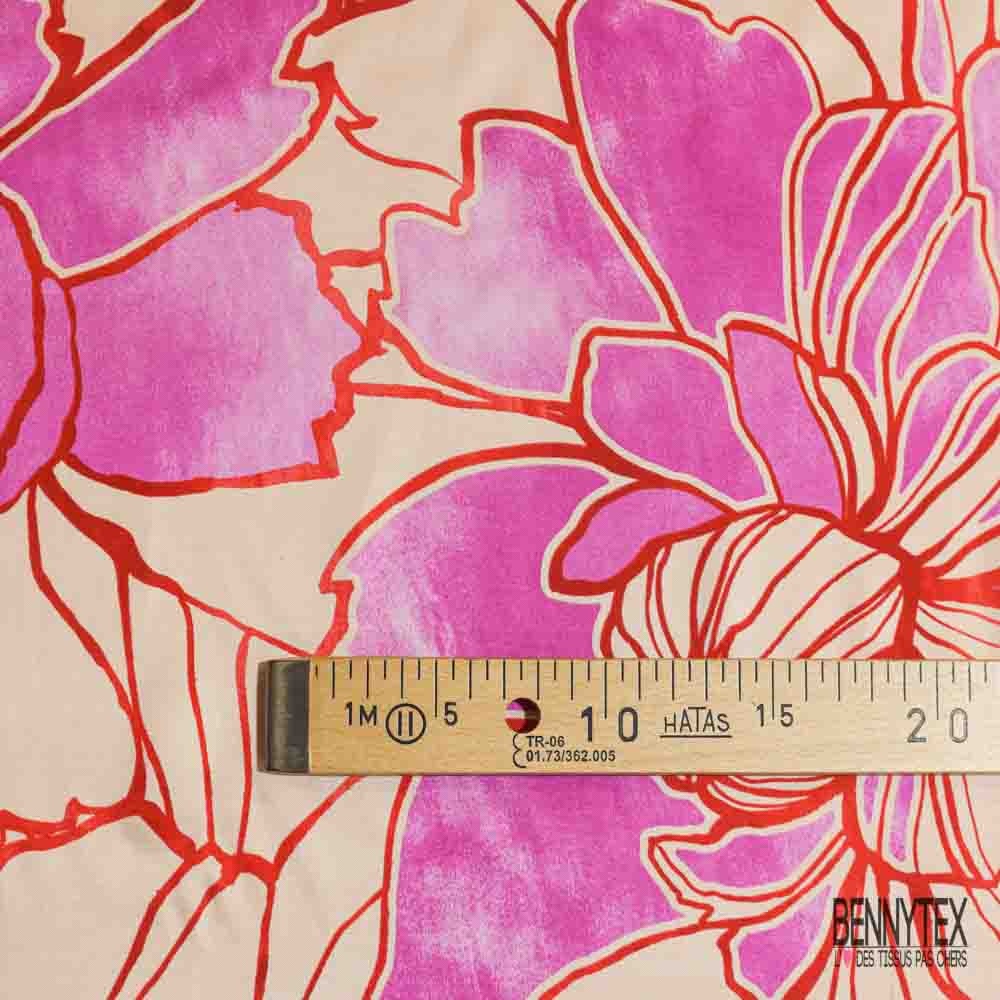 Satin viscose imprimé digital floral tropical pêche rose