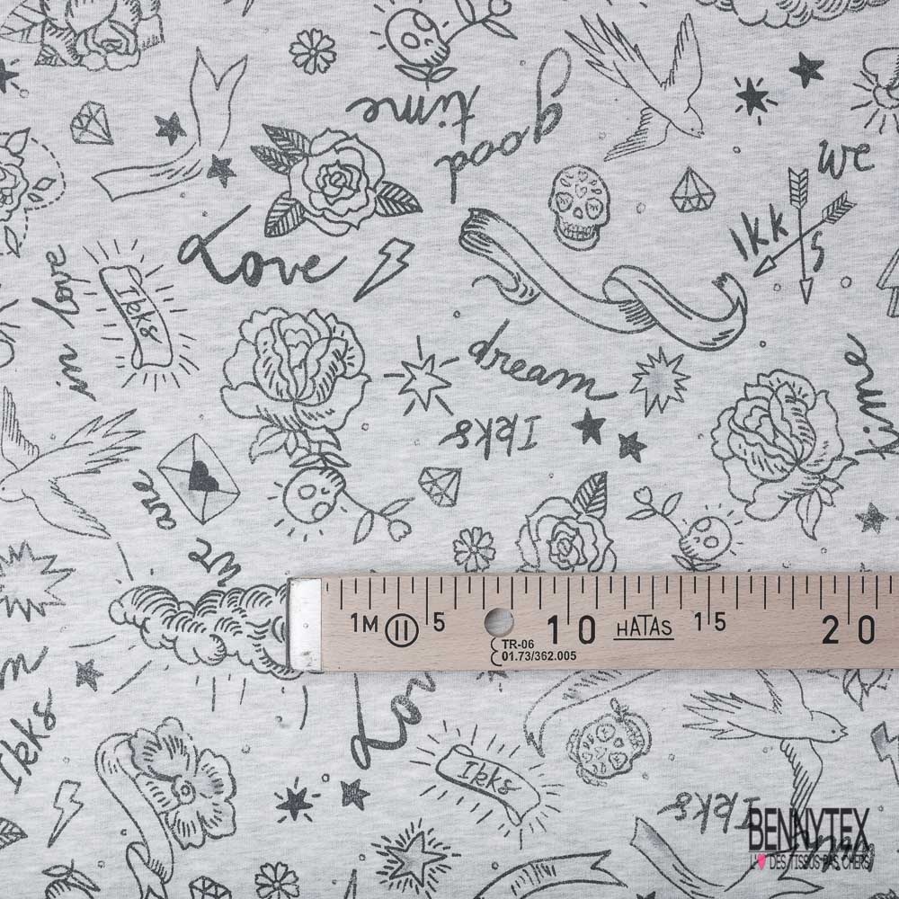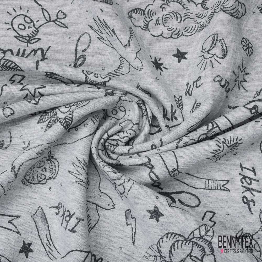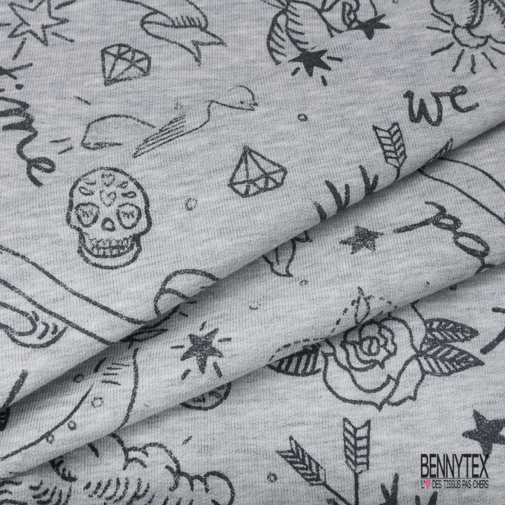 Molleton bouclette imprimé tatouage tête de mort rose fond gris clair chiné grande laize