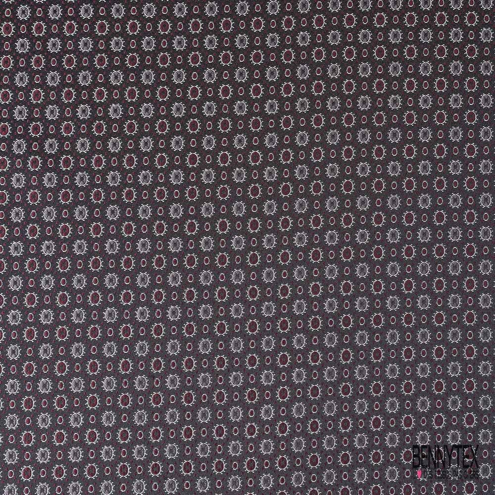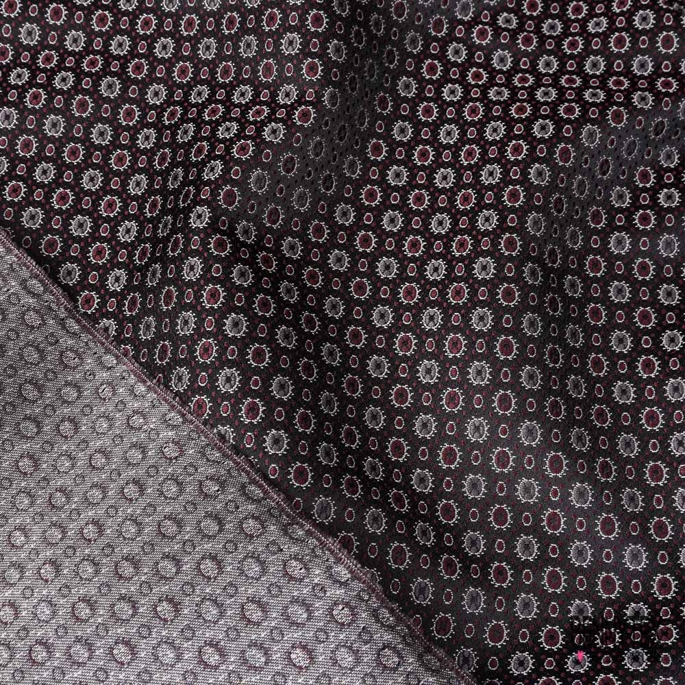 Le Jacquard polyester motif cravate bordeaux gris bleuté fond anthracite est une matière à effet de tissage.