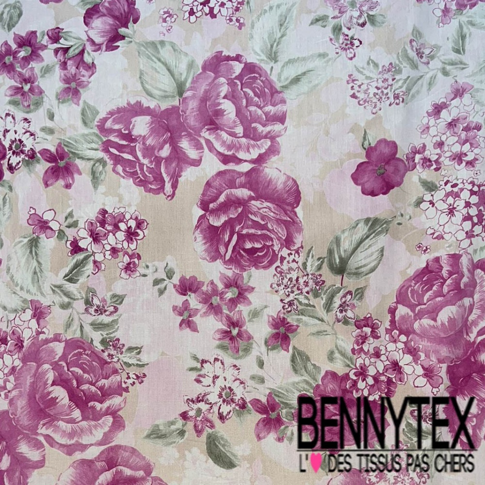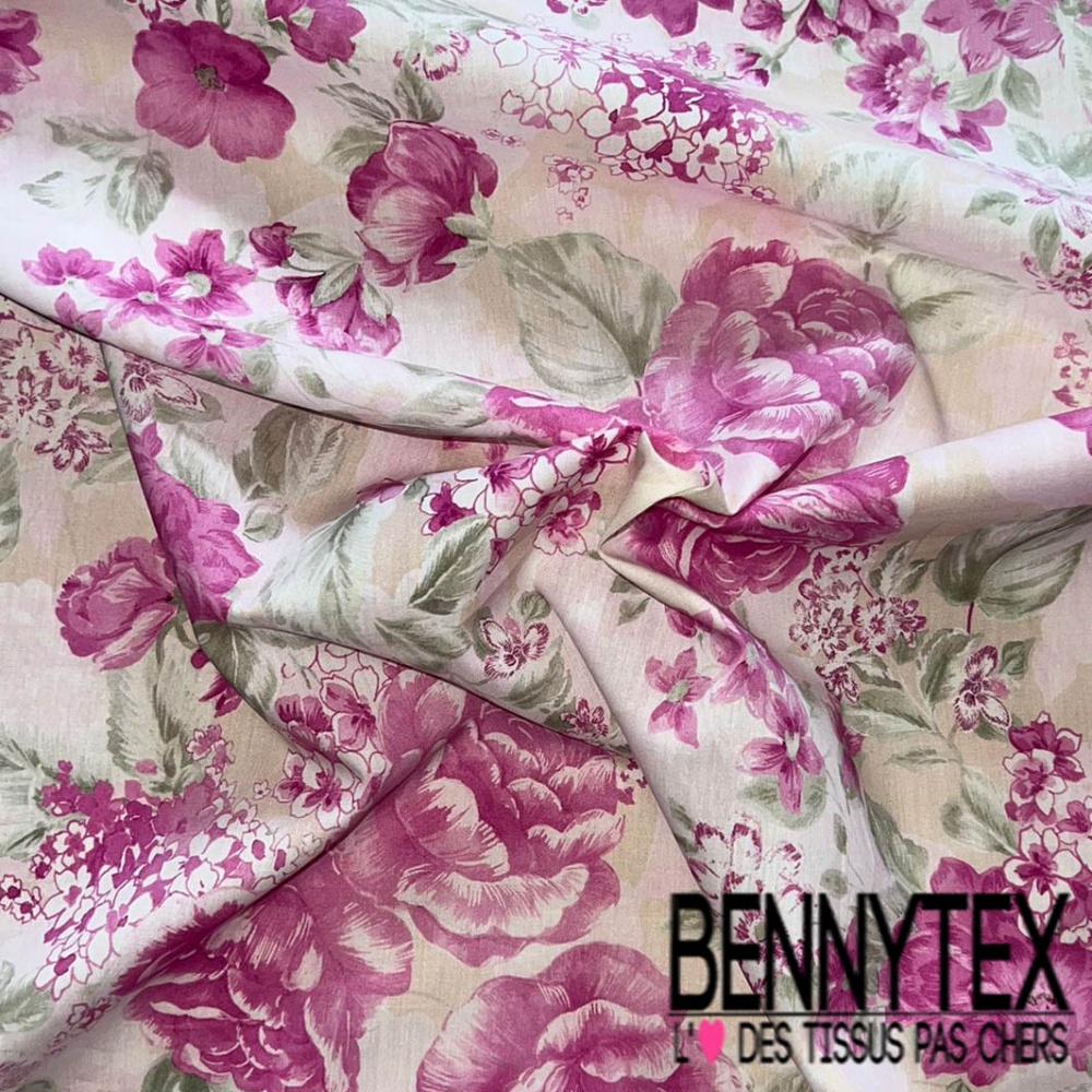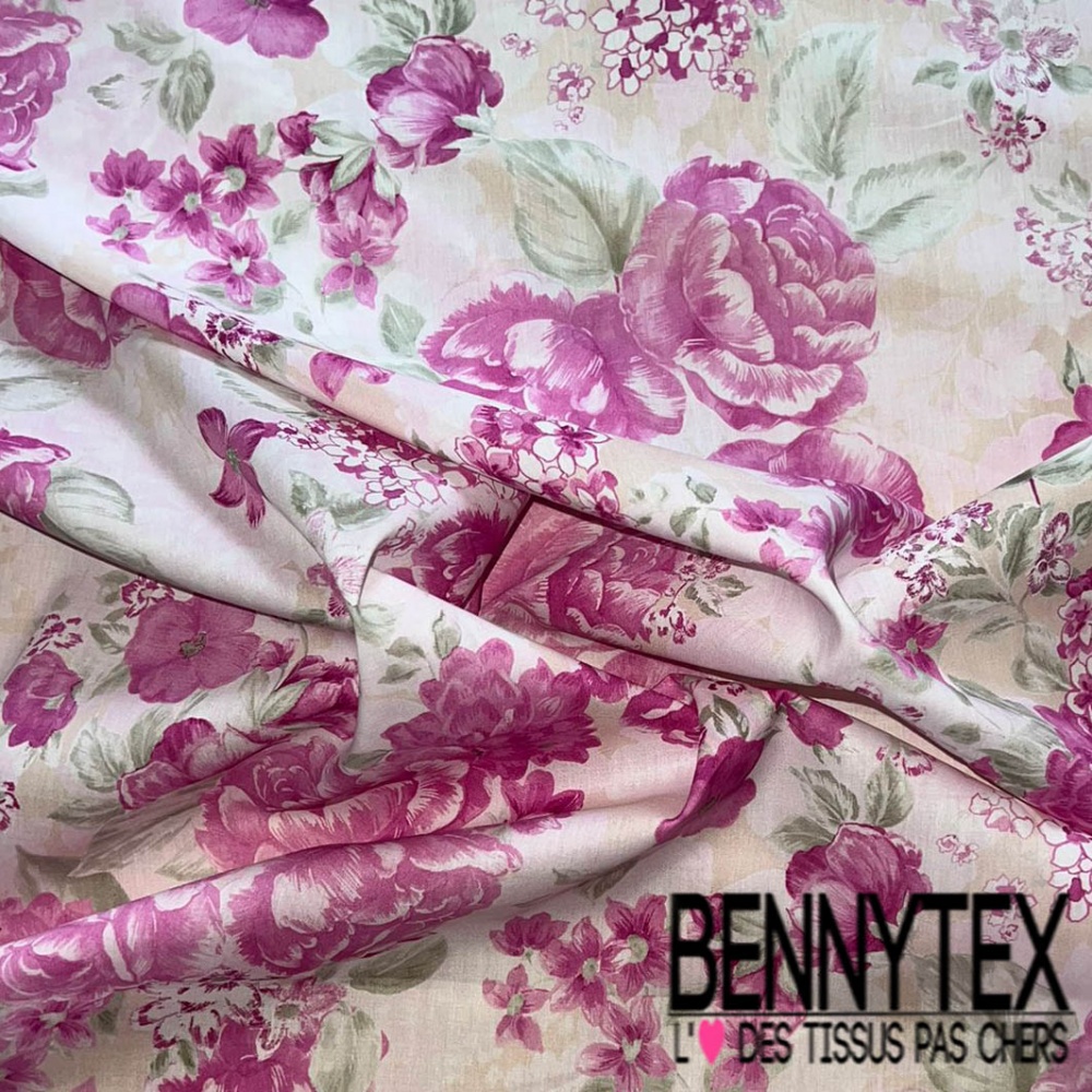 Coton imprimé floral shabby ton rose fond coquille d'oeuf rose pastel
