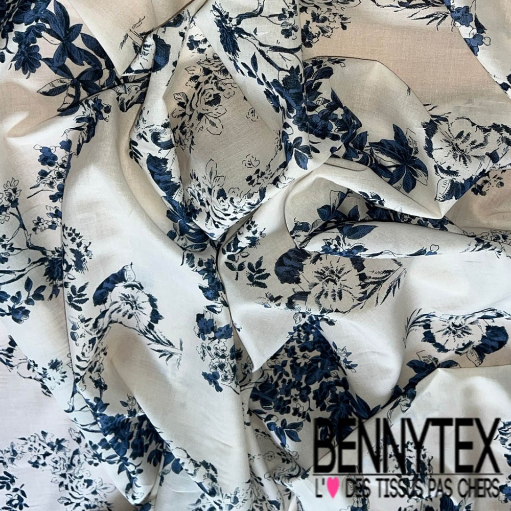 Voile coton imprimé floral navy fond crème