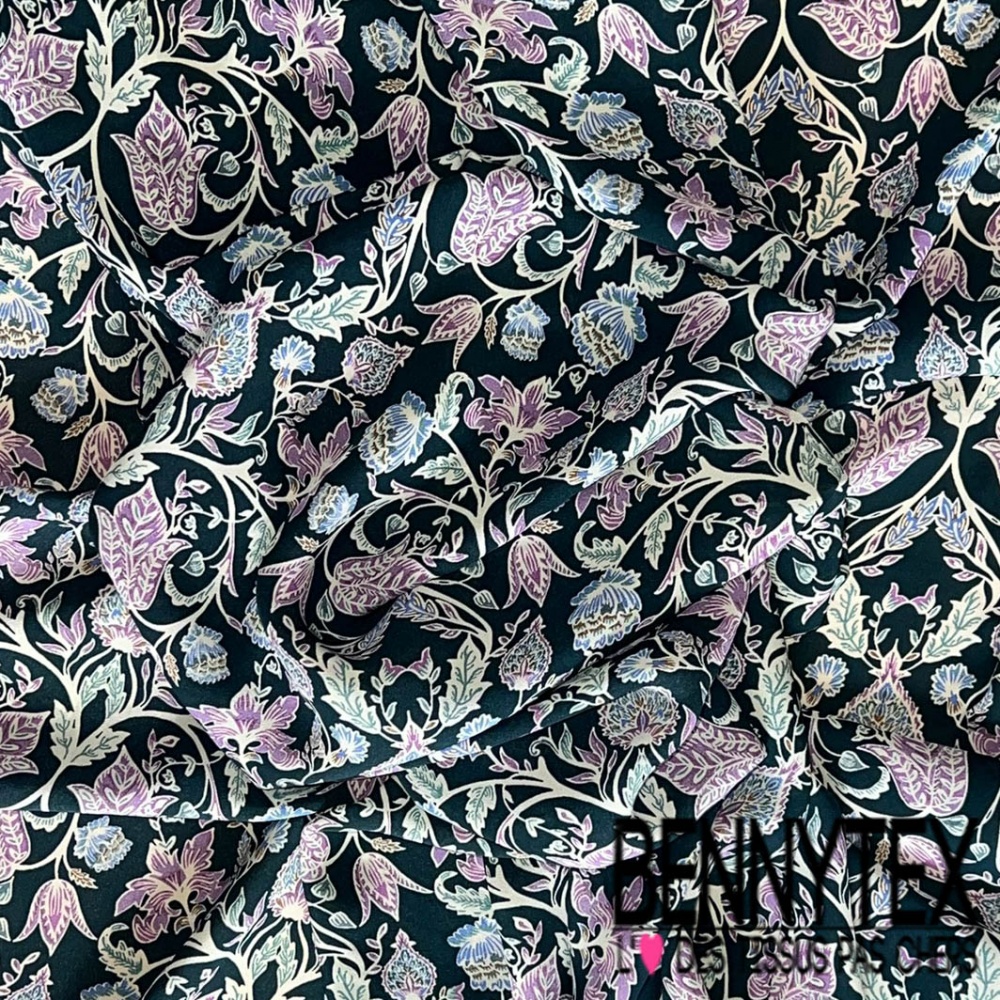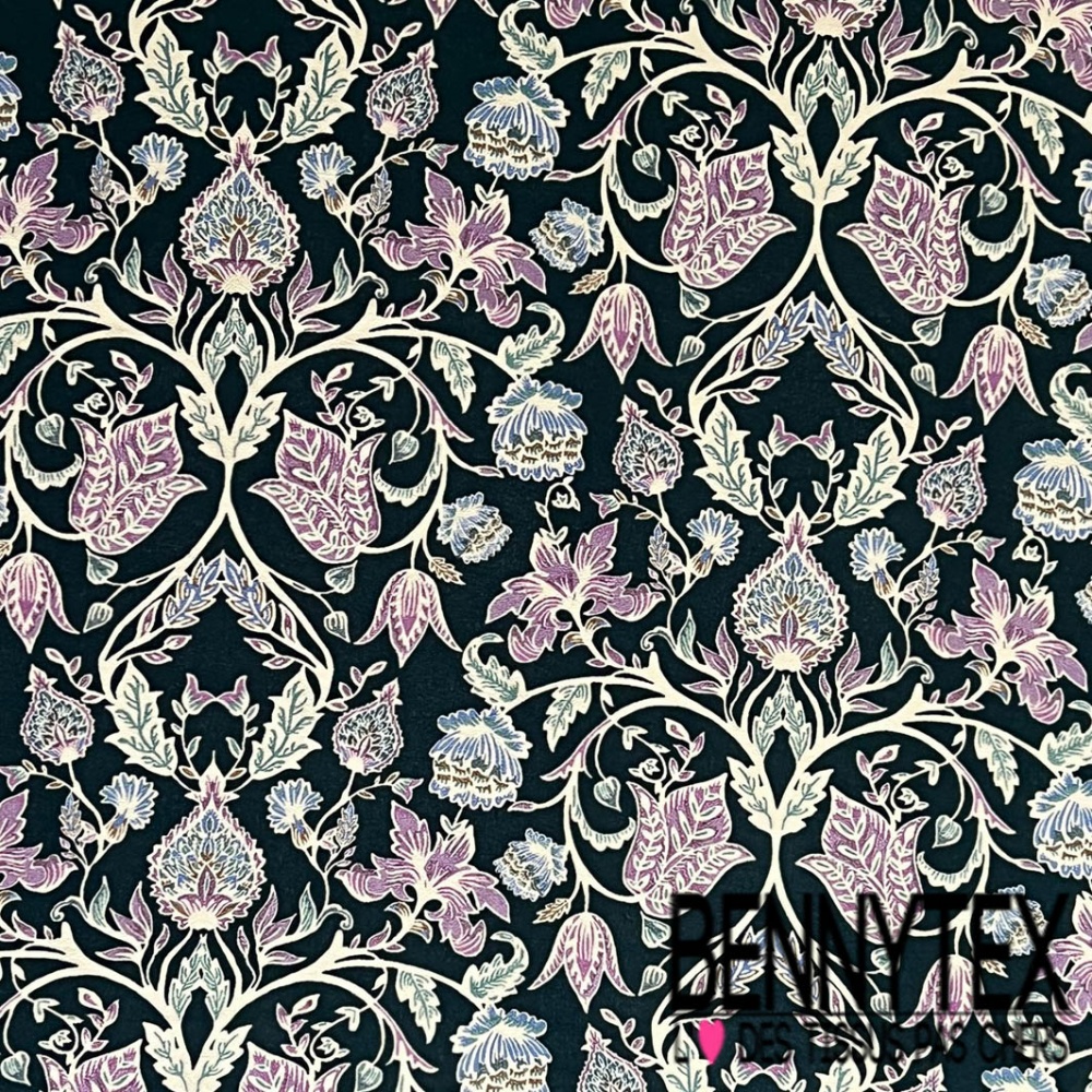 Satin viscose fin imprimé digital floral cachemire fond pétrole profond