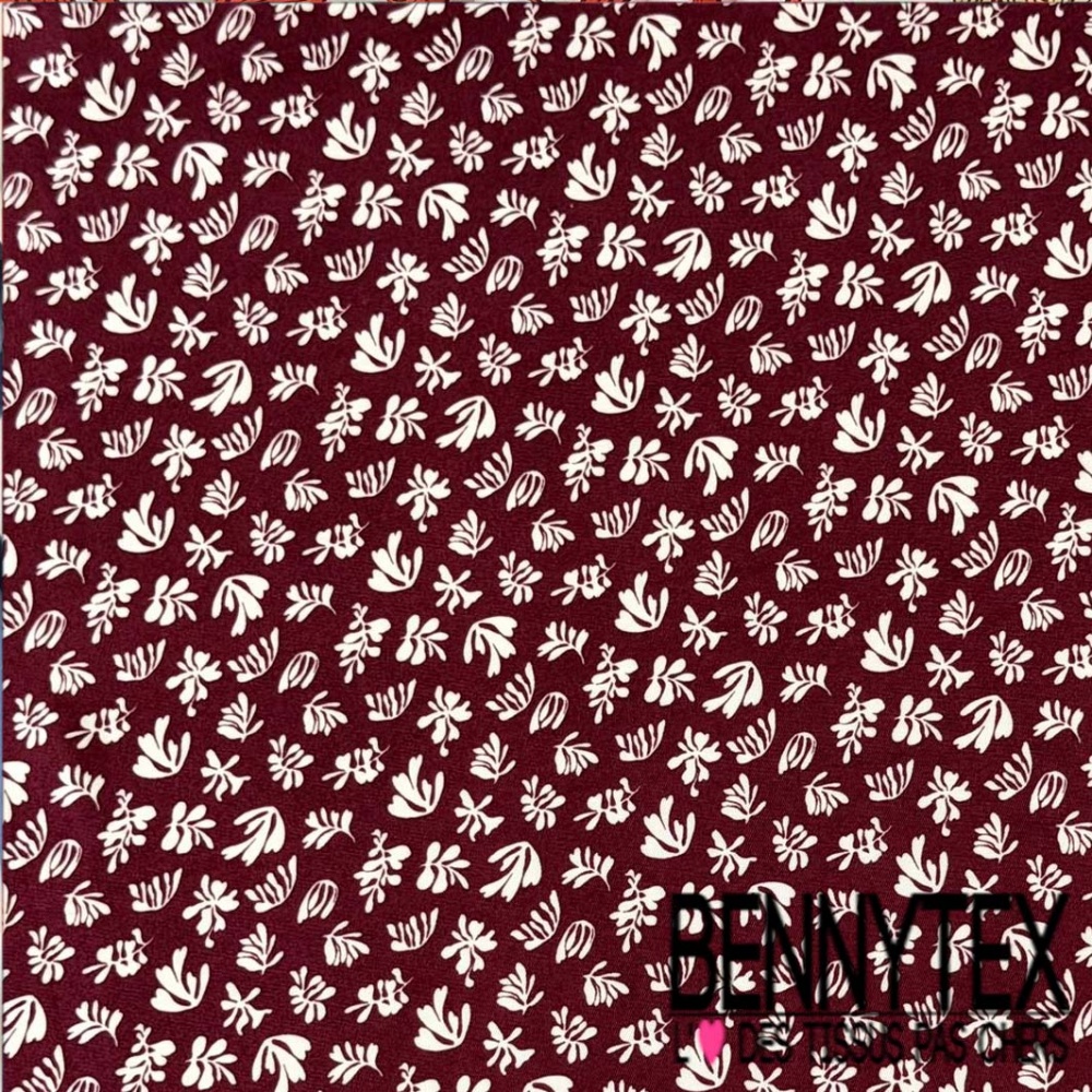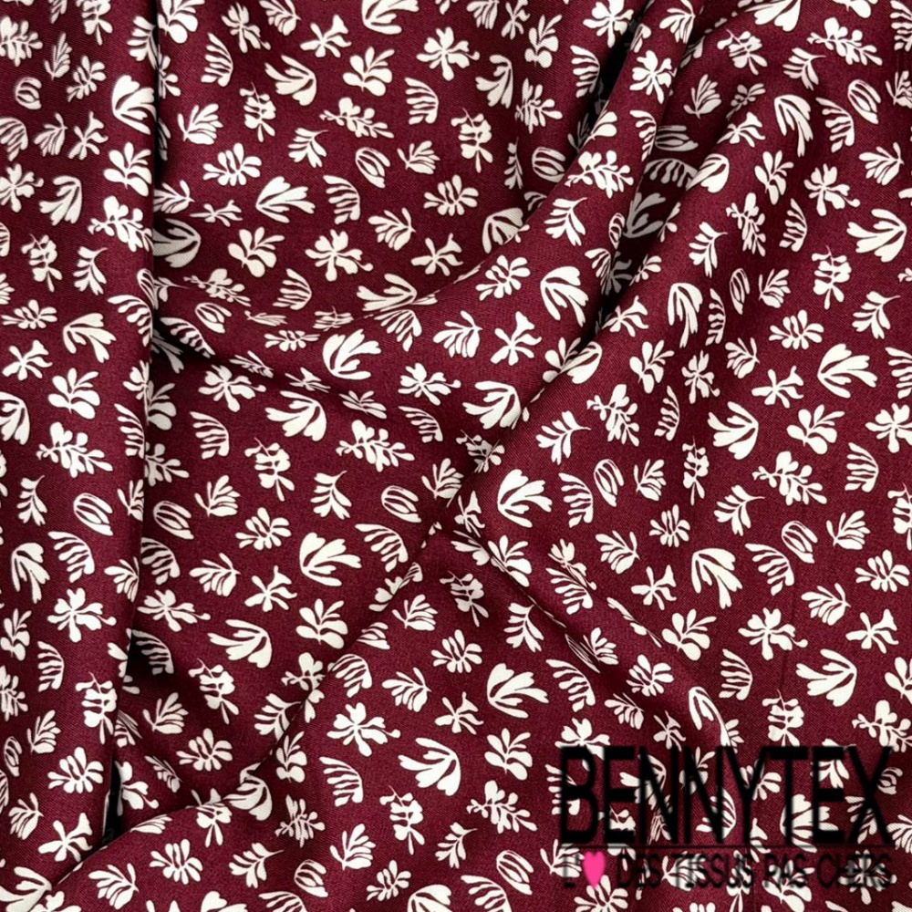 Satin twill viscose imprimé digital petite plante blanc cassé fond lie de vin