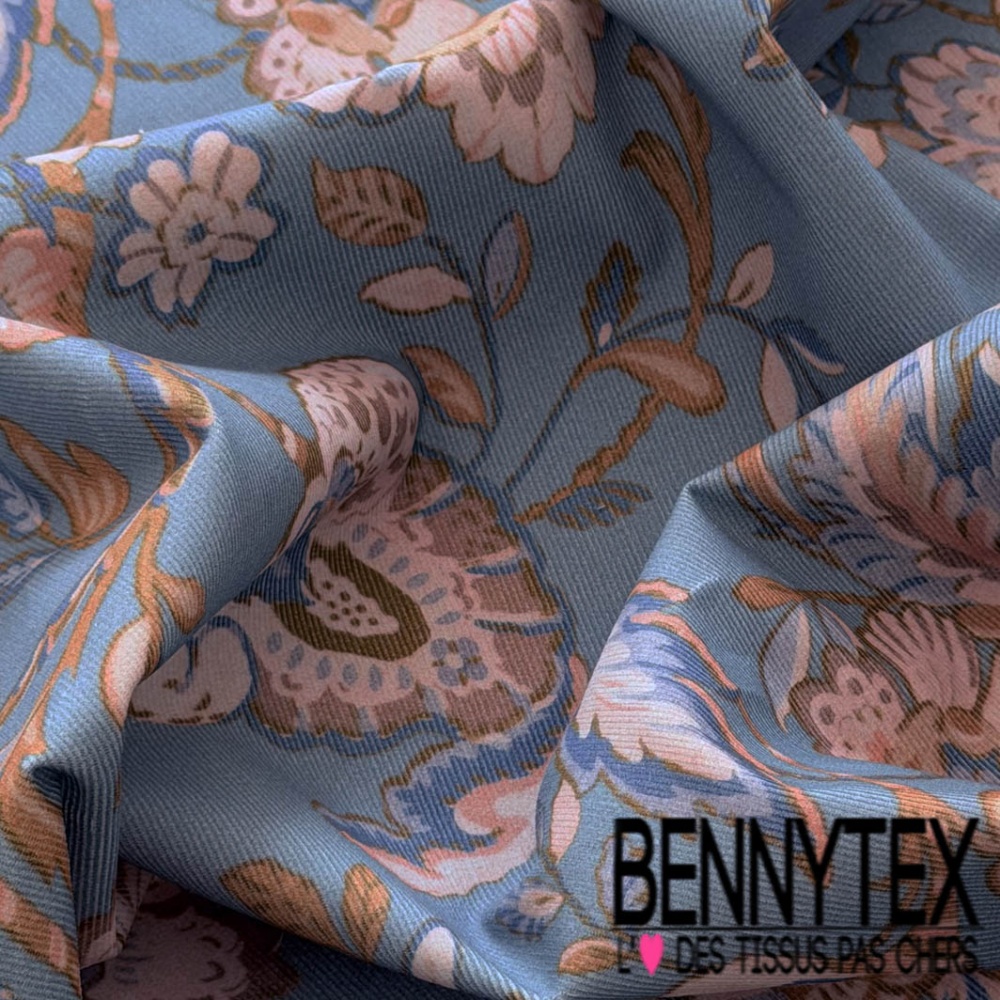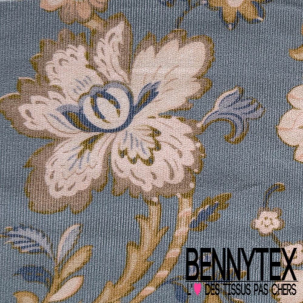 Velours milles raies élasthanne imprimé grande fleur cachemire fond bleu charron