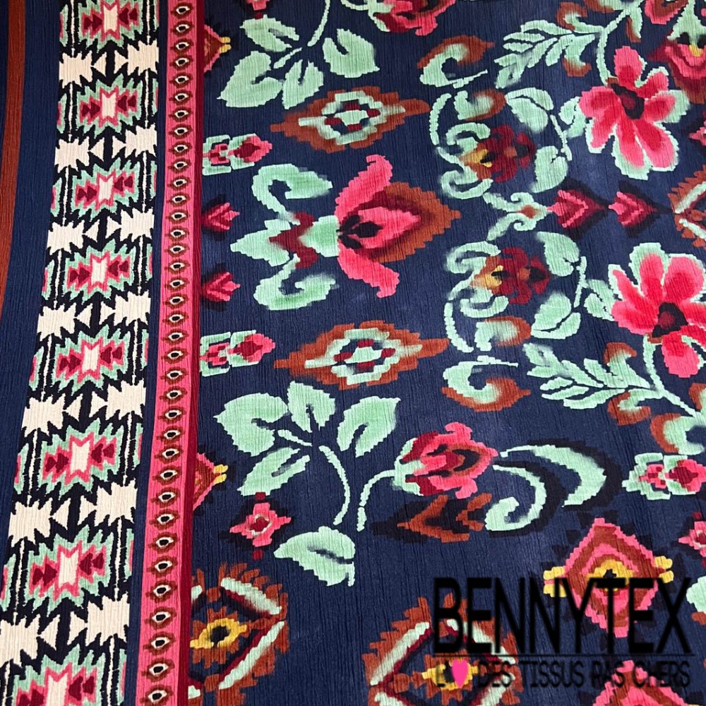 Crêpon viscose simple base imprimé amérindien multicolore fond marine
