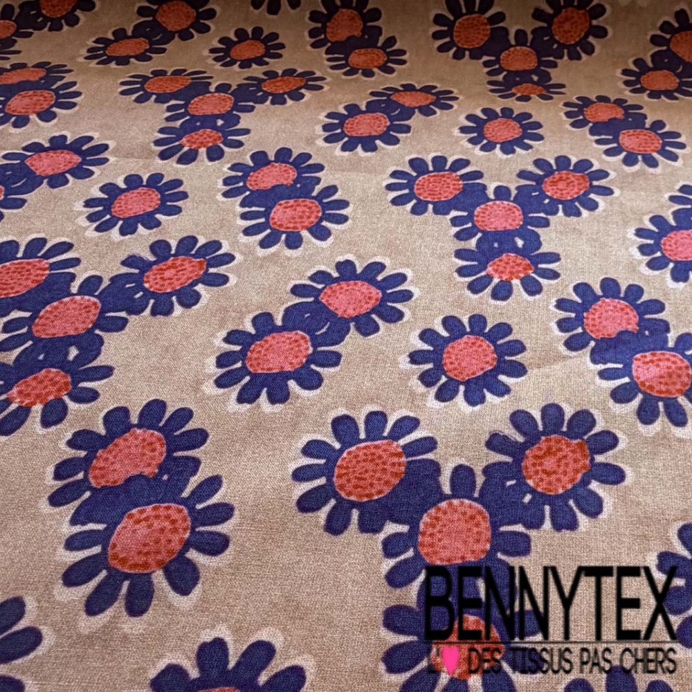 Voile coton élasthanne imprimé floral naïf marine corail fond beige chaud